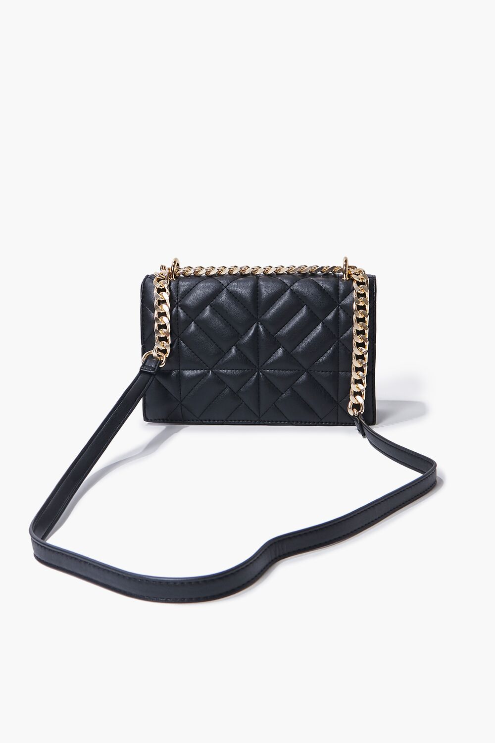 A faux leather crossbody bag featuring a front quilted design. flap top. high-polish hardware. partial curb chain shoulder strap. and a structured body.