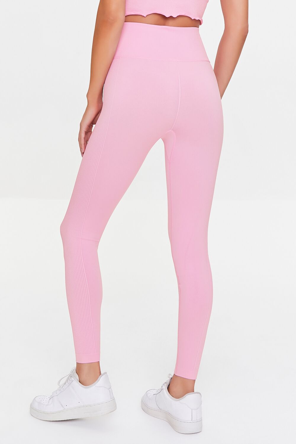 An athletic pair of knit leggings featuring an elasticized high-rise waist and ribbed side panels.