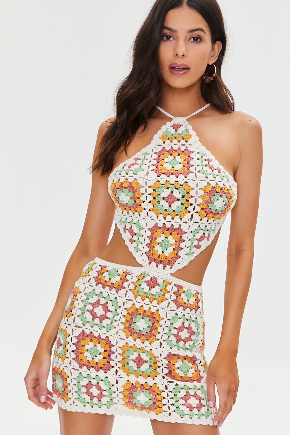A crochet mini dress featuring an allover granny square pattern. midsection and back cutouts. a halter neckline which leads to a lace-up back. open-knit design. as well as a bodycon silhouette. This item is unlined and layering garments are not included.
