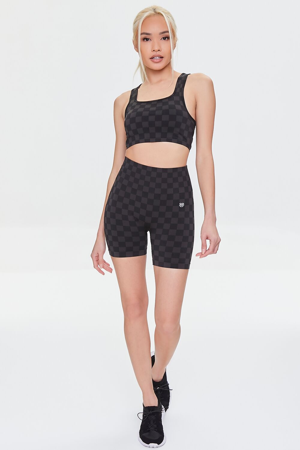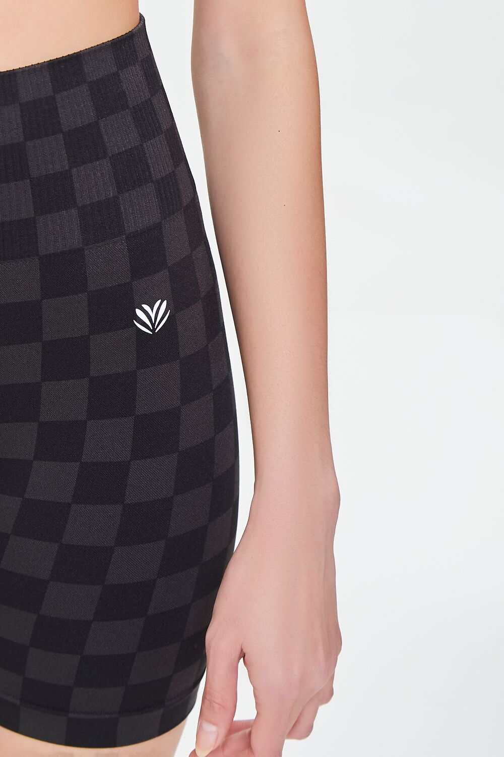 An athletic pair of knit biker shorts featuring an allover checkered print. ribbed waistband. and a high rise.