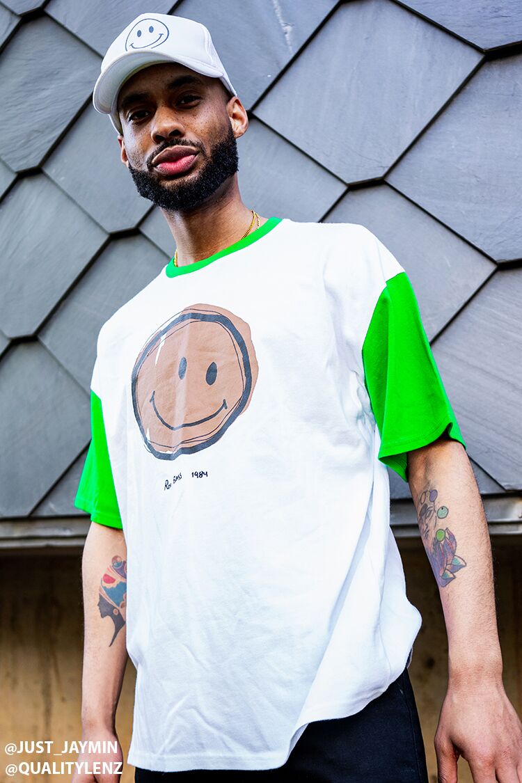 In collaboration with artist Ron Bass. this knit raglan tee features front artwork graphic. dropped shoulders. and contrasting short sleeves and crew neck.