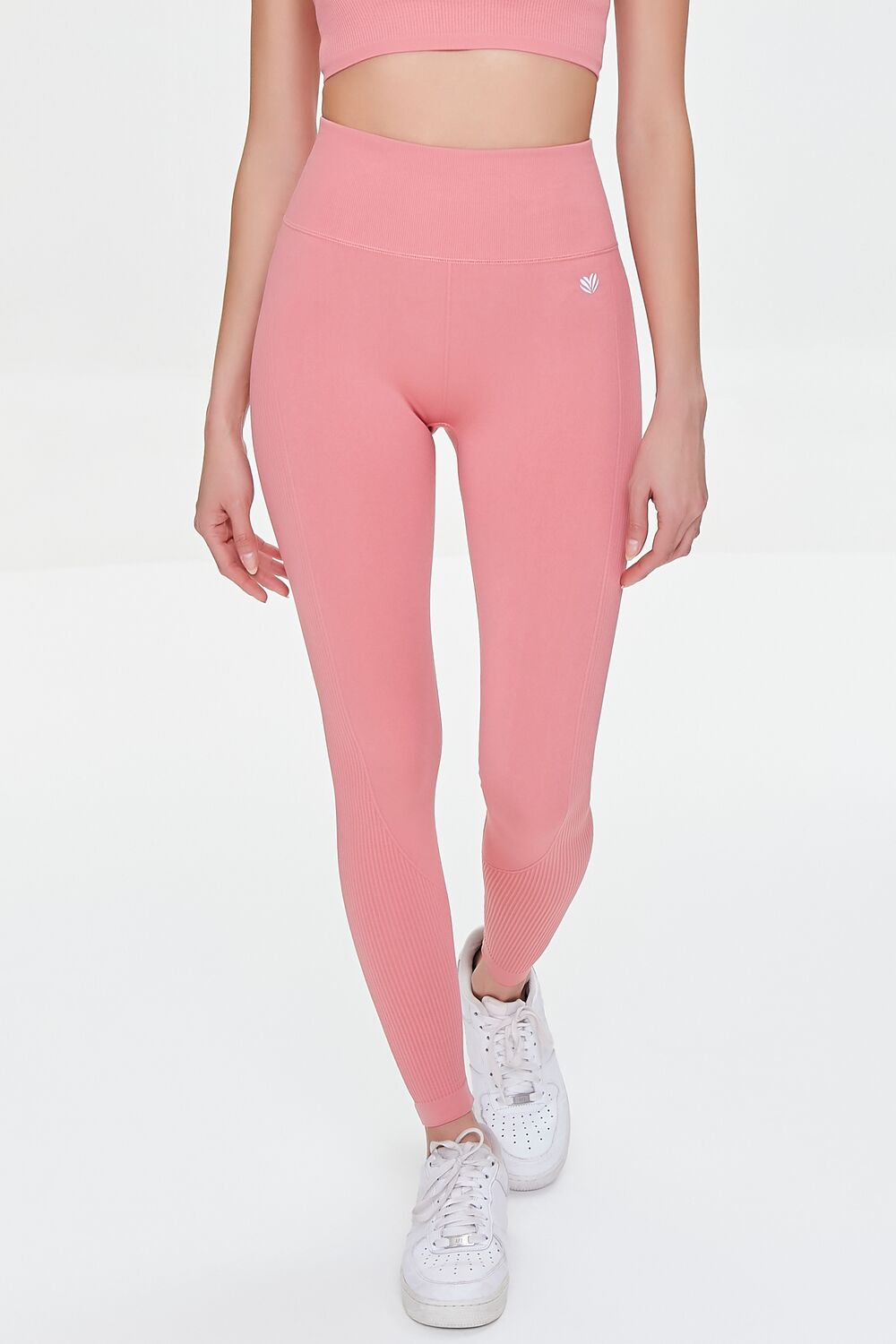 A pair of athletic knit leggings featuring a high rise. banded waist. and ribbed sides.