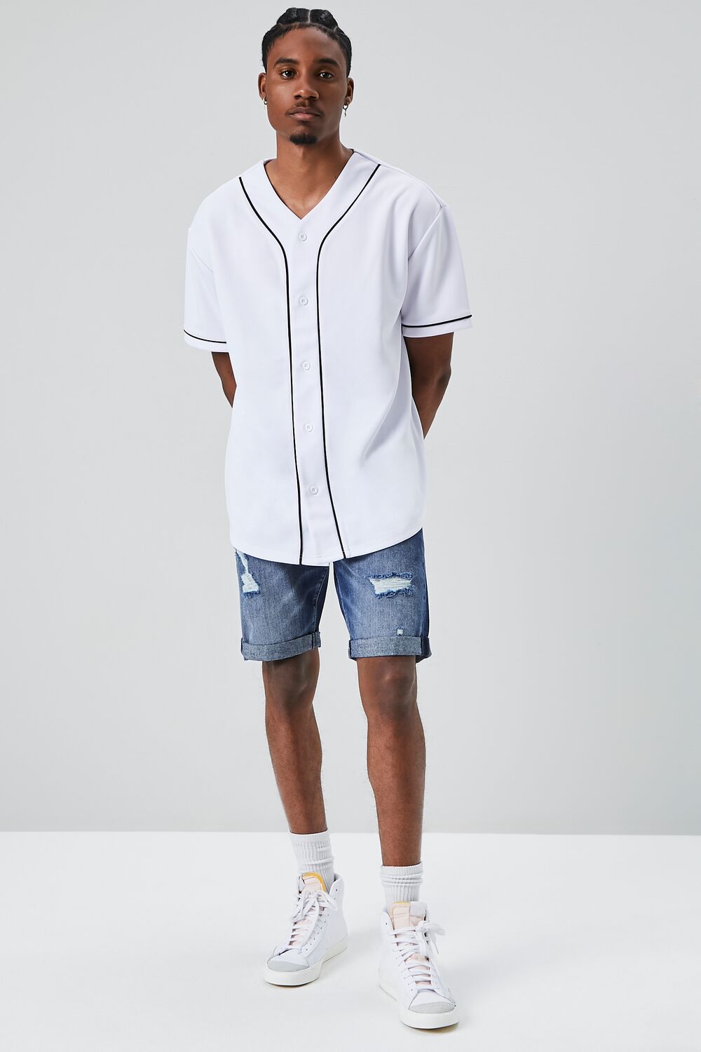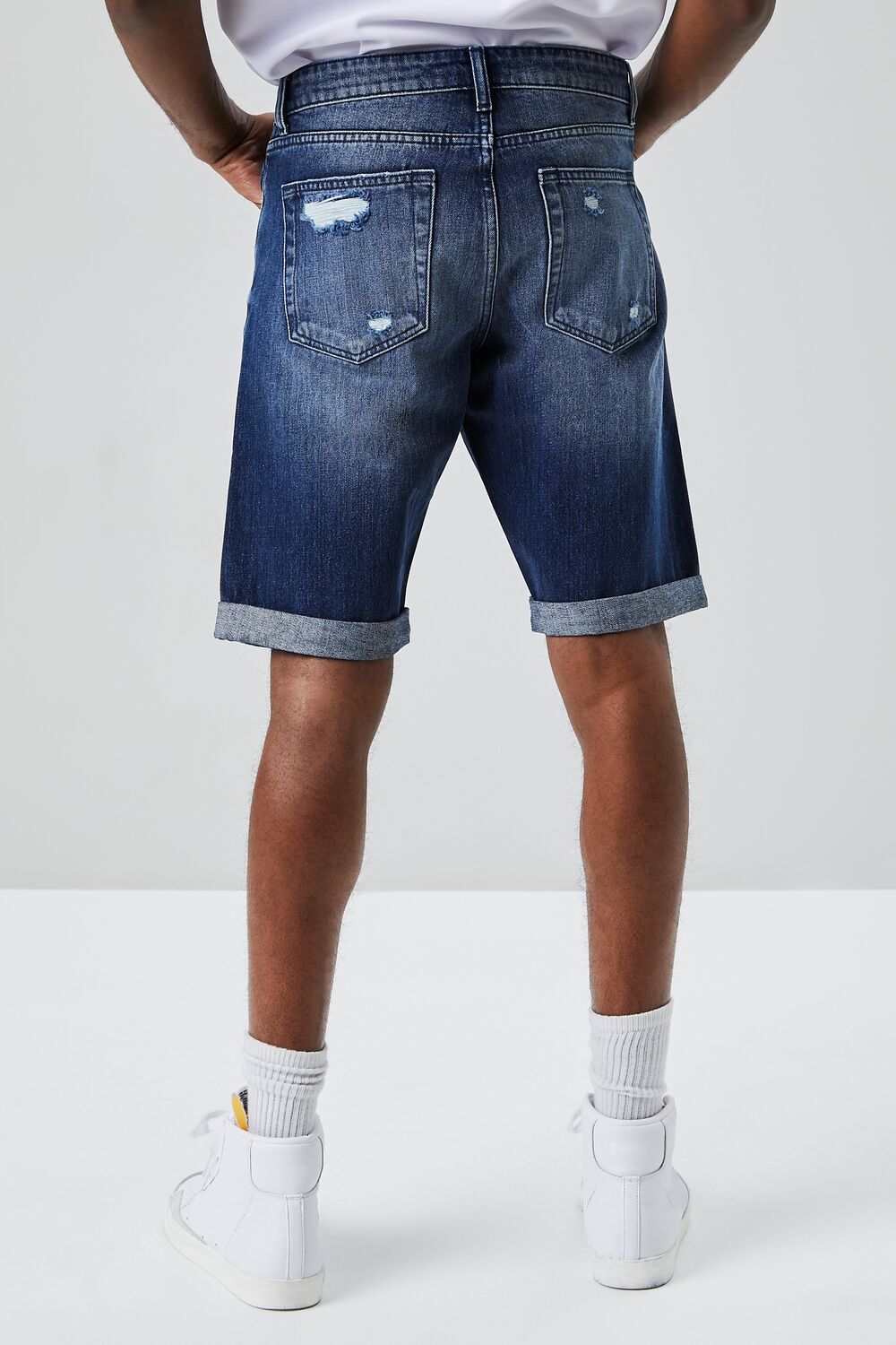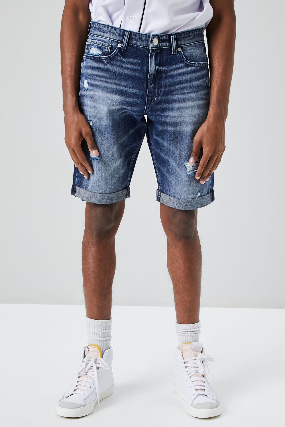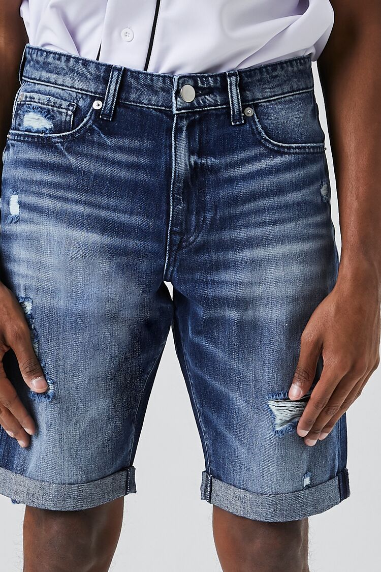 A pair of denim shorts crafted from cotton featuring a zip fly with button closure. whiskering. light distressing throughout. five-pocket construction. belt loops. and a rolled hem.