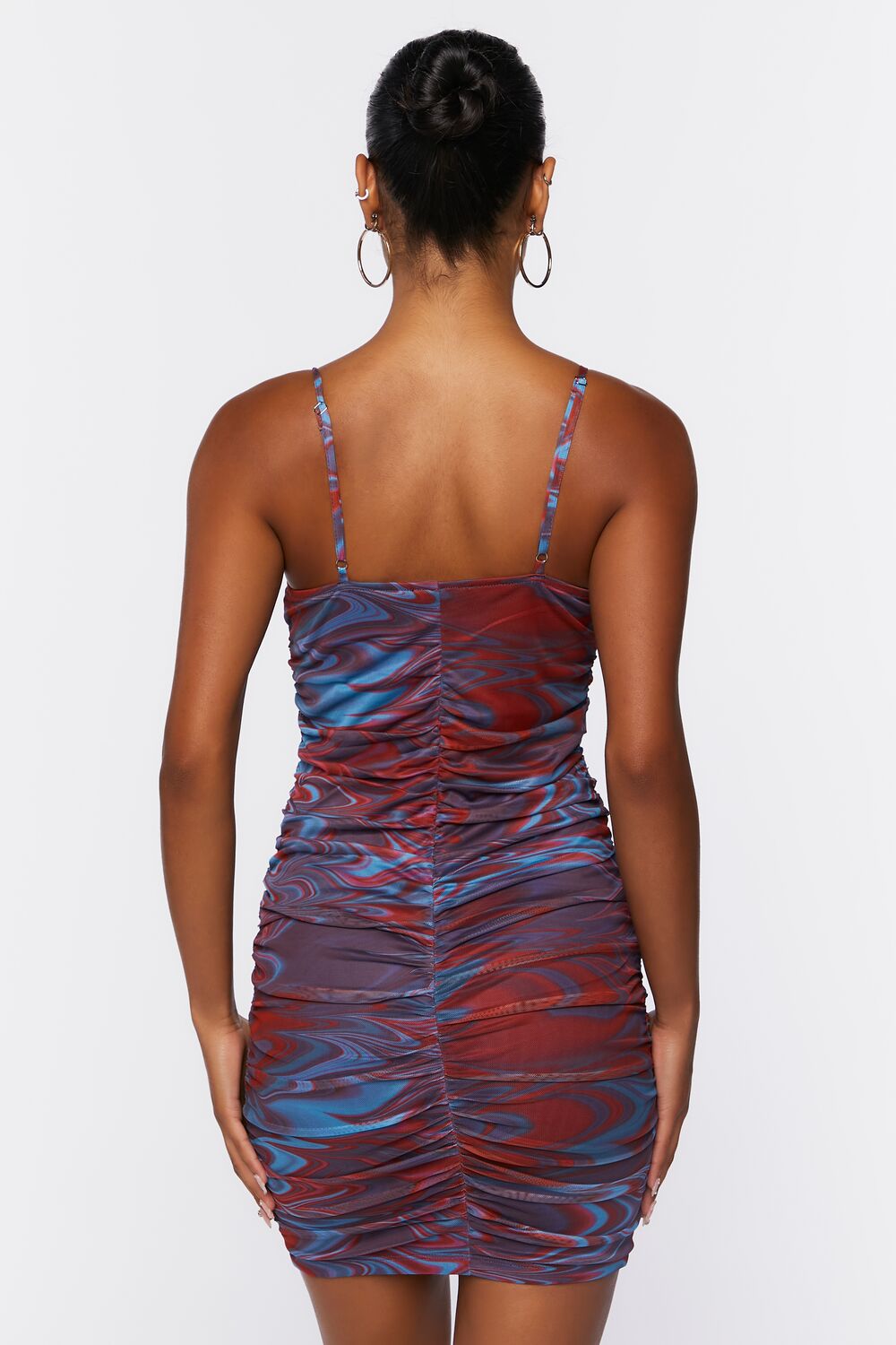 A mesh mini dress featuring an allover abstract print. ruched construction. straight-cut neck and back. adjustable cami straps. and a bodycon silhouette.