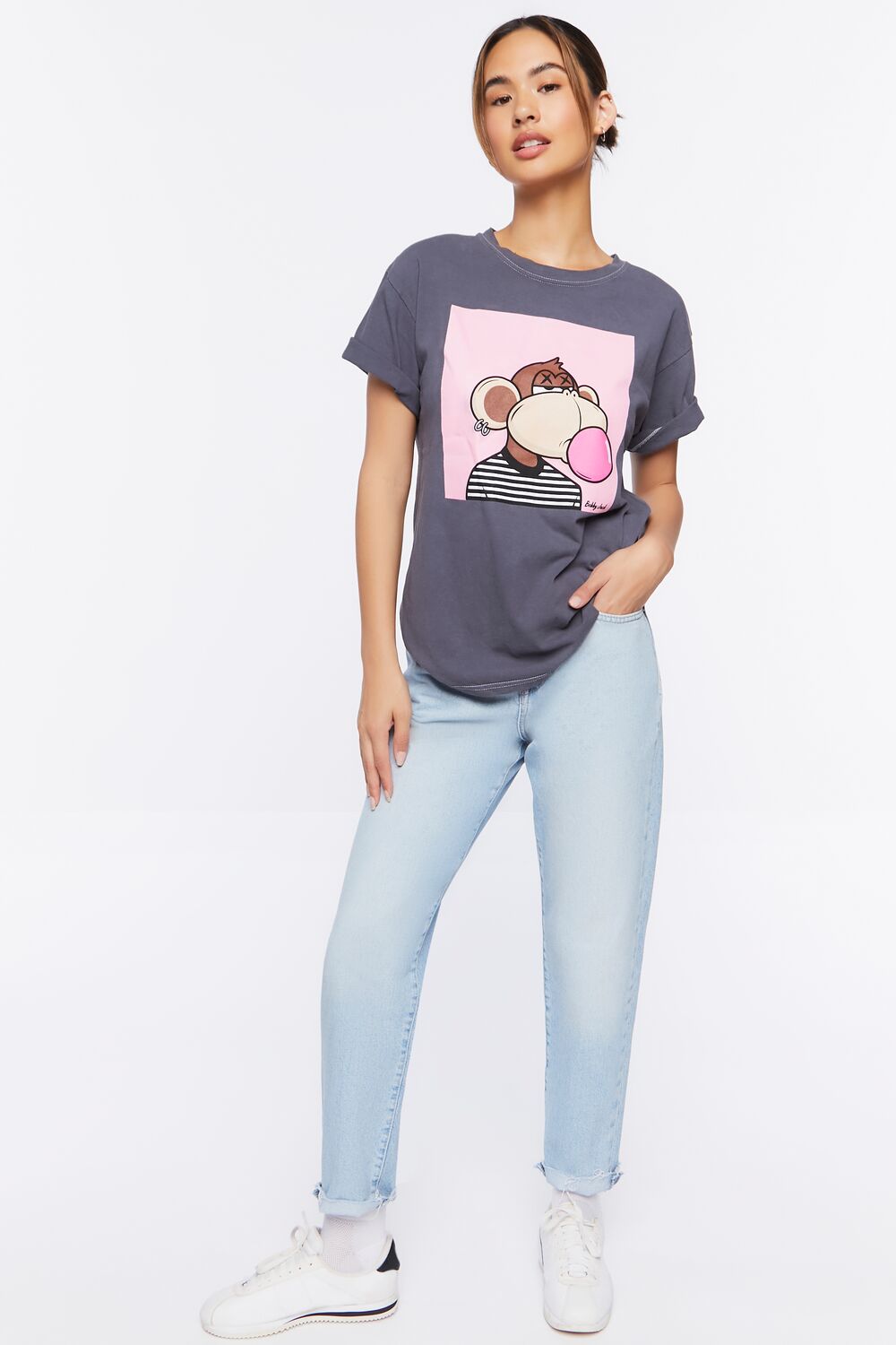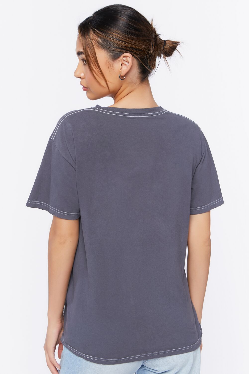 A knit tee featuring front 'Bobby Jack' text and accompanying graphic. short sleeves. a crew neck. boxy fit. and contrast topstitching.