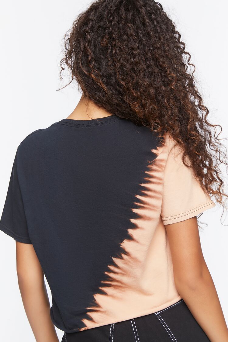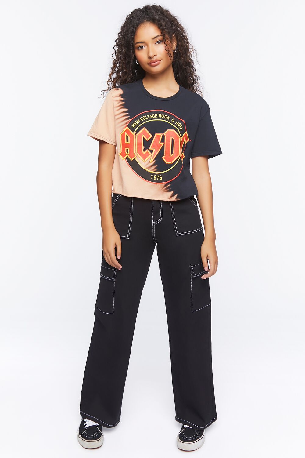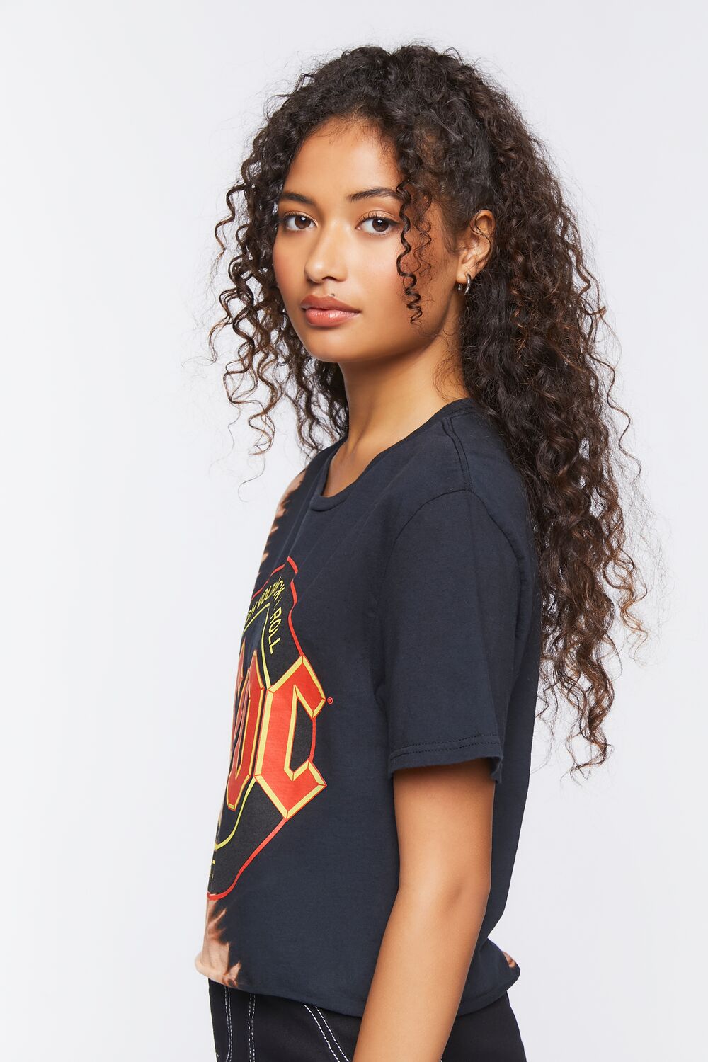 A knit tee featuring an allover bleach dye wash with a split design. 'ACDC' logo graphic with 'High Voltage Rock N Roll' and '1979' text. short sleeves. a crew neck. and cropped hem.