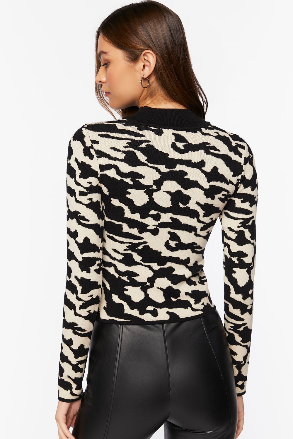 A knit sweater featuring an allover abstract pattern. front cutout. mock neck. and long sleeves.