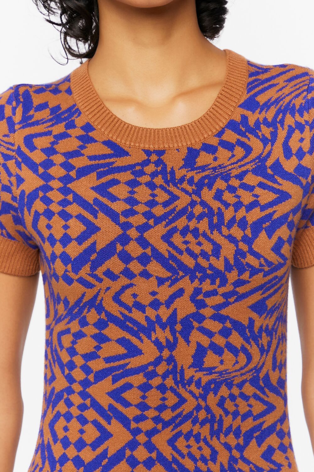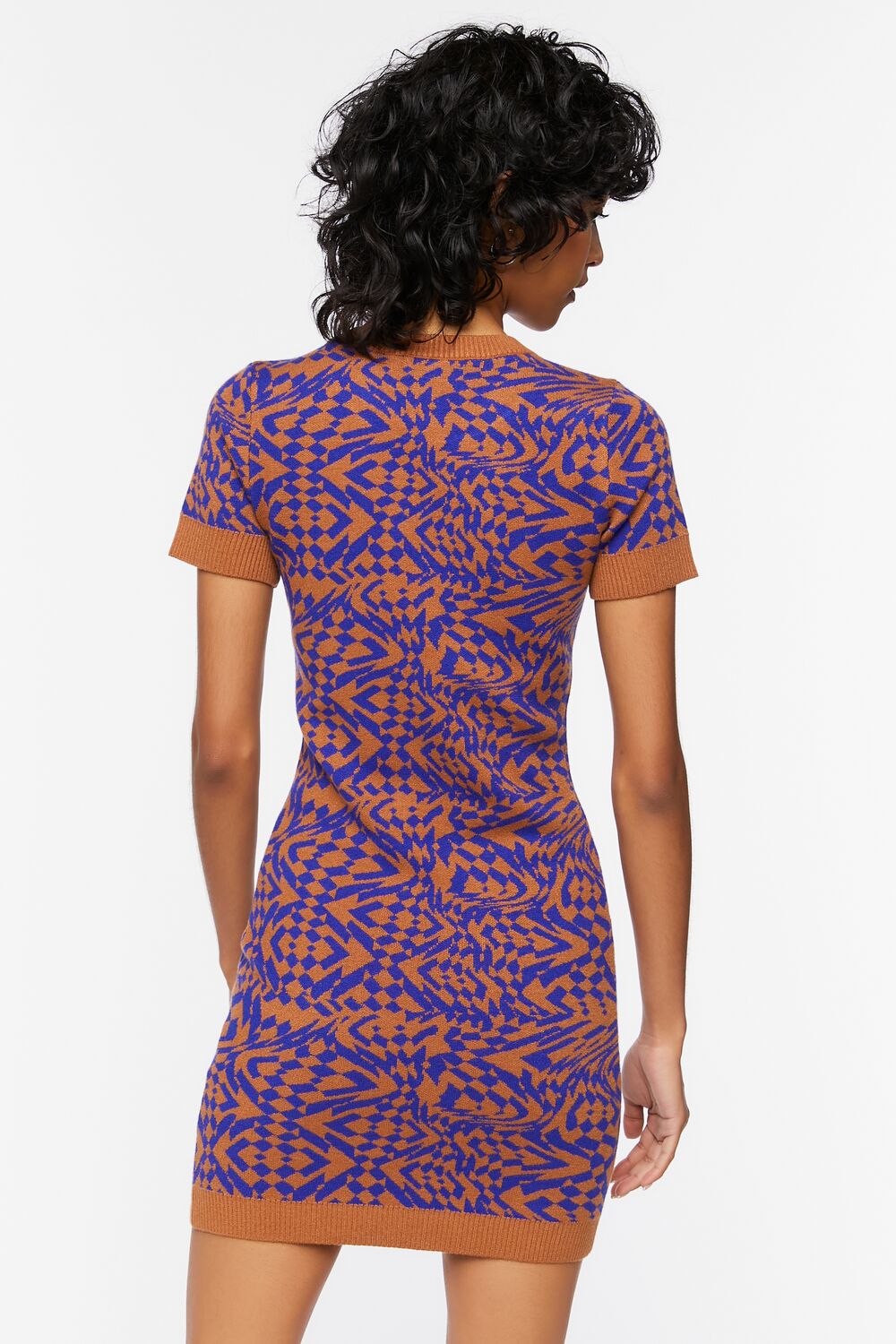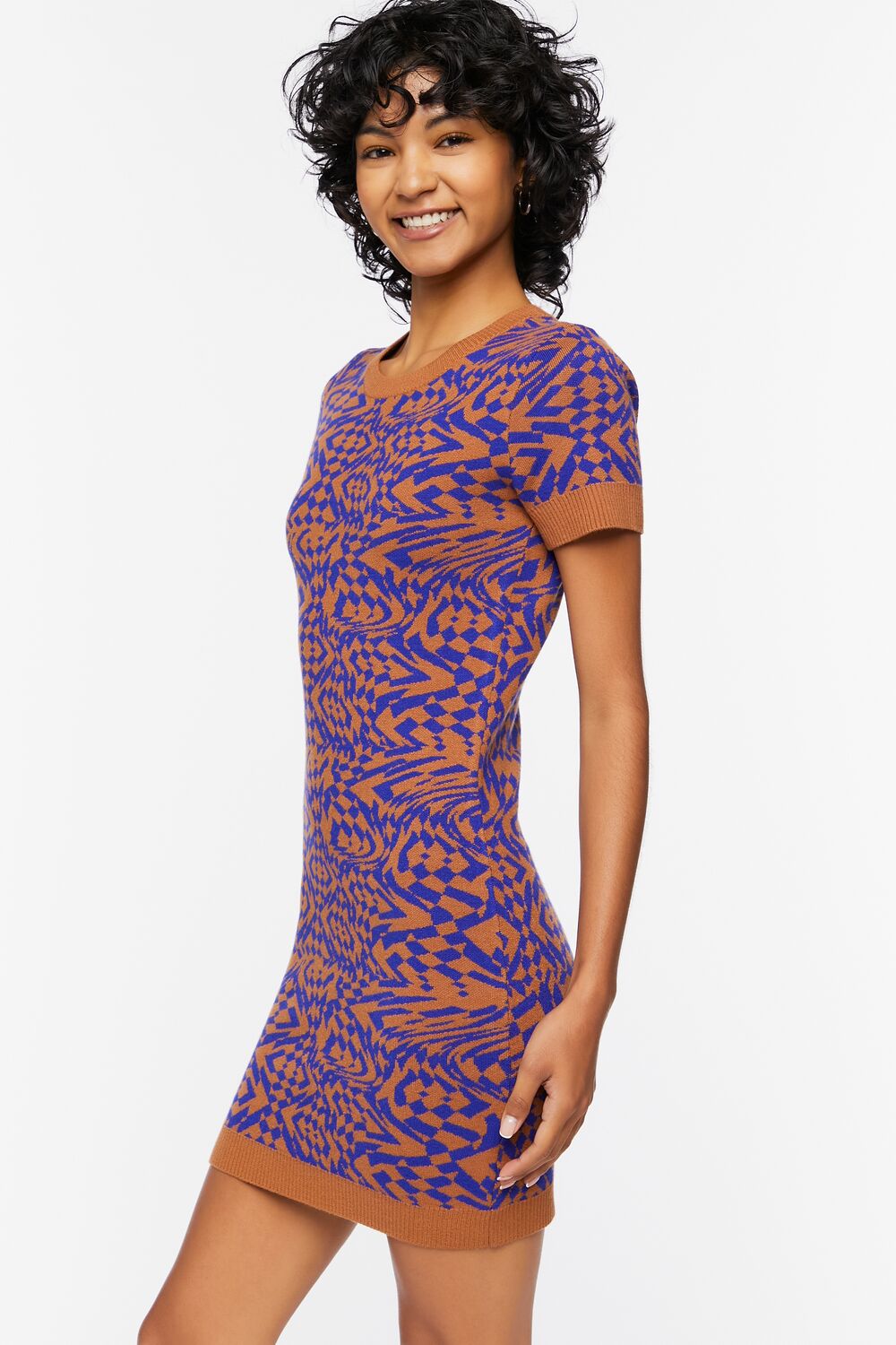 A knit sweater dress featuring an allover abstract pattern. round neckline. ribbed trim. short sleeves. mini length. and bodycon silhouette.