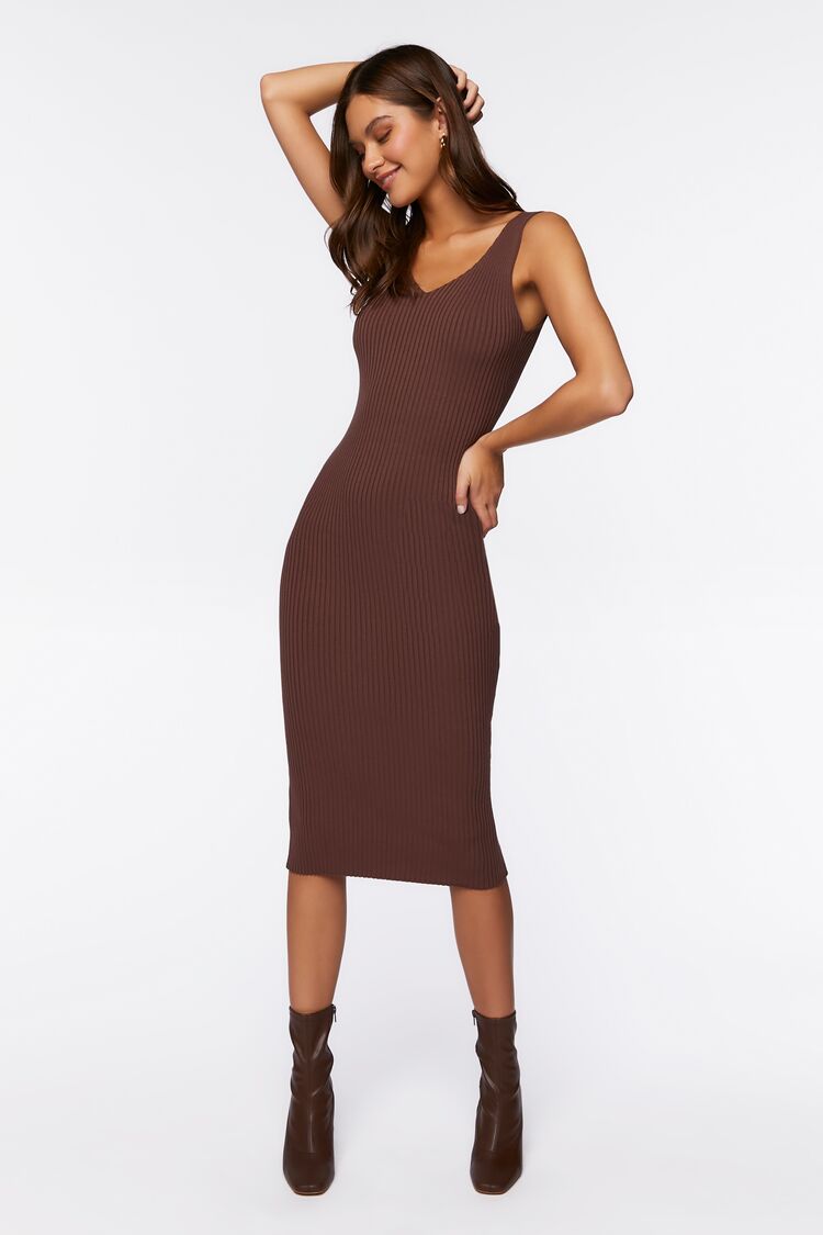 A ribbed knit sweater dress featuring a V-neckline and back. shoulder straps. midi length. and a bodycon silhouette.