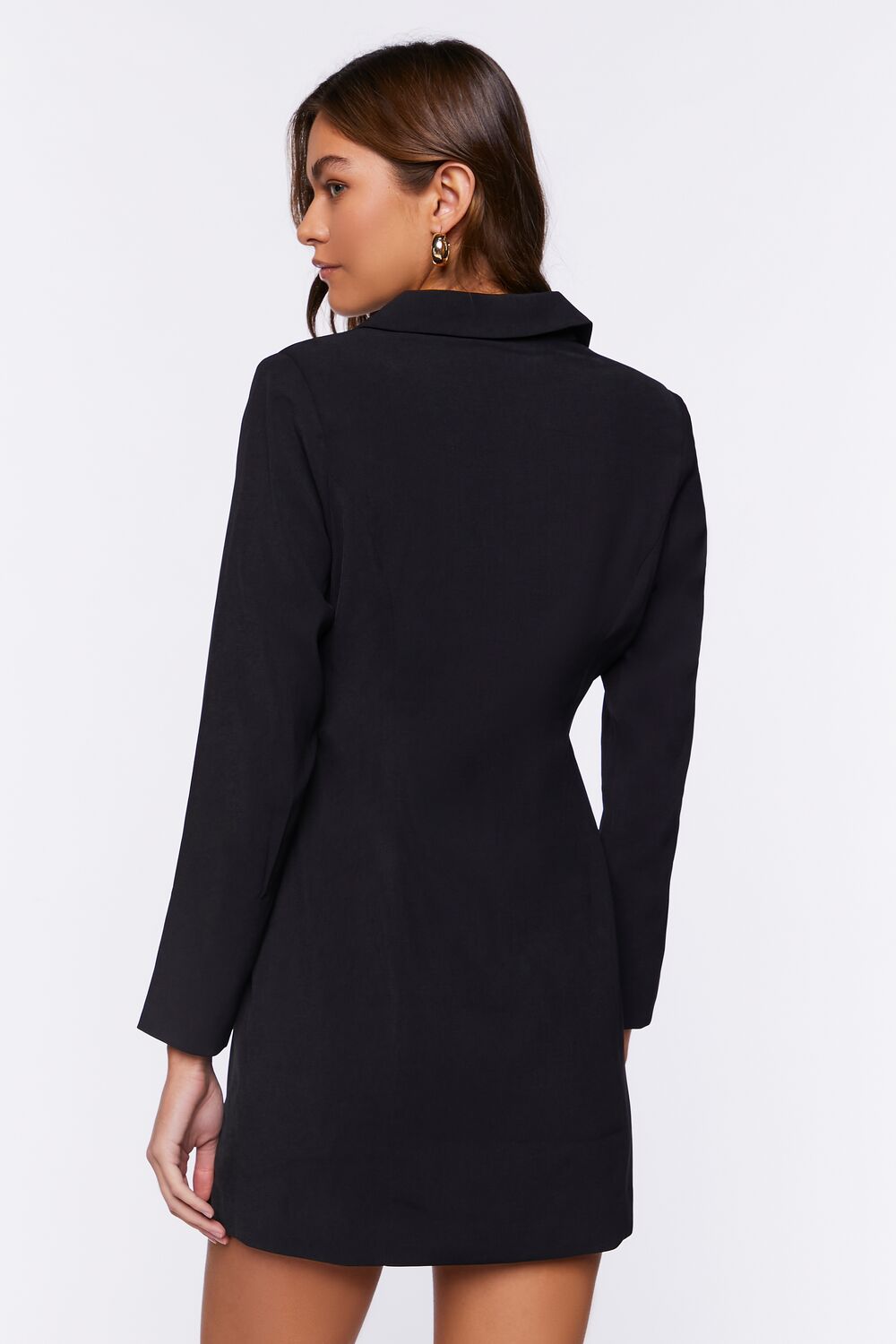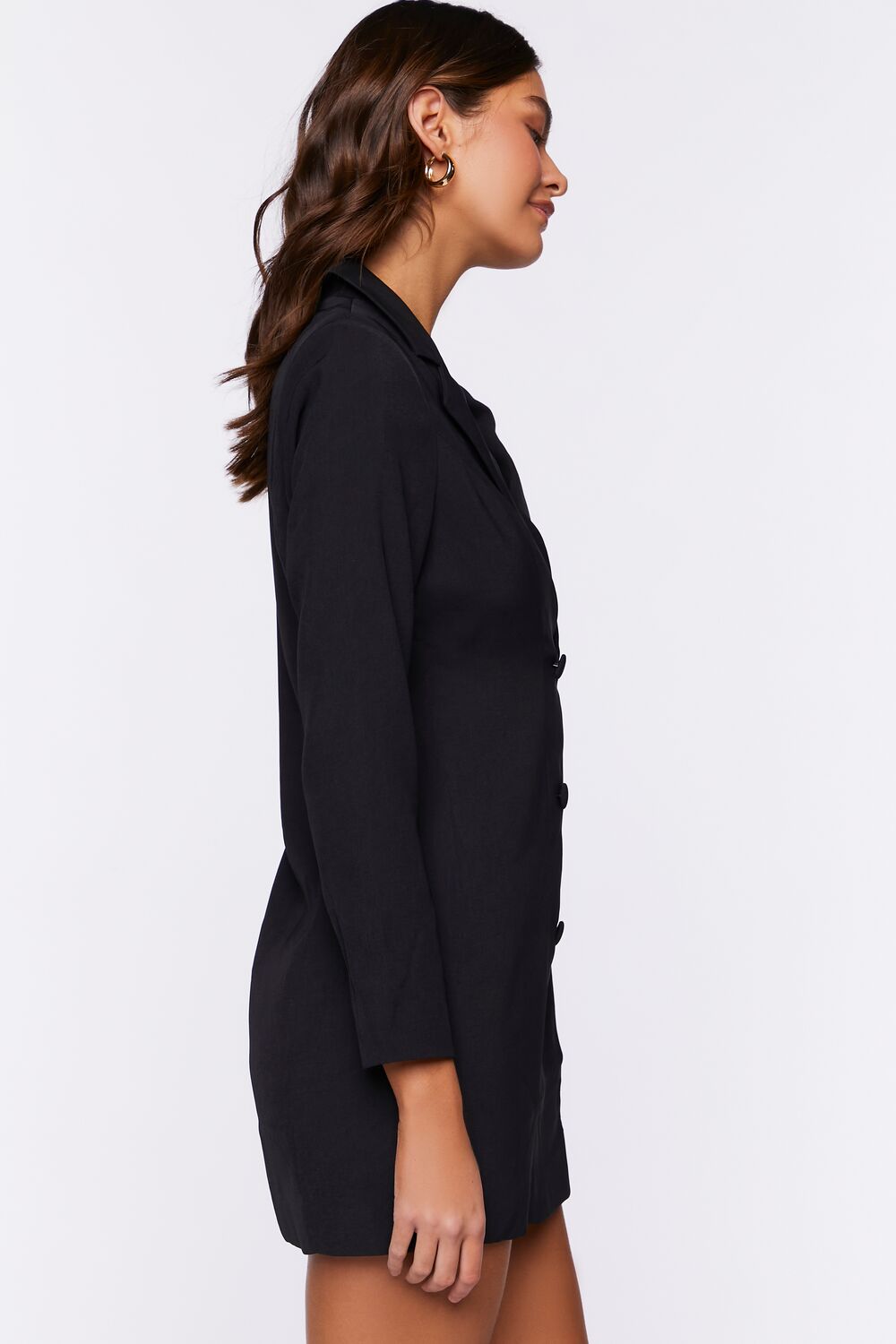 A woven blazer dress featuring a plunging neckline. double-breasted design. notched lapels. long sleeves. and a mini length.