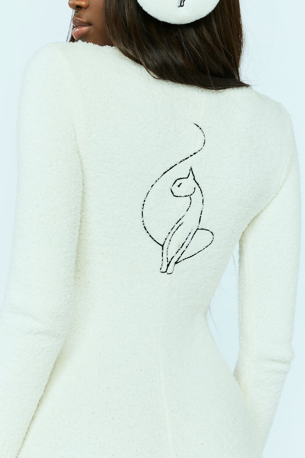 From our Feelings Star x Baby Phat collection. this fuzzy knit lounge romper features a plunging V-neckline. snap-button front closures. front embroidered 'BP' text. back cat embroidery. and long sleeves.