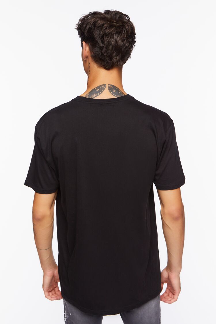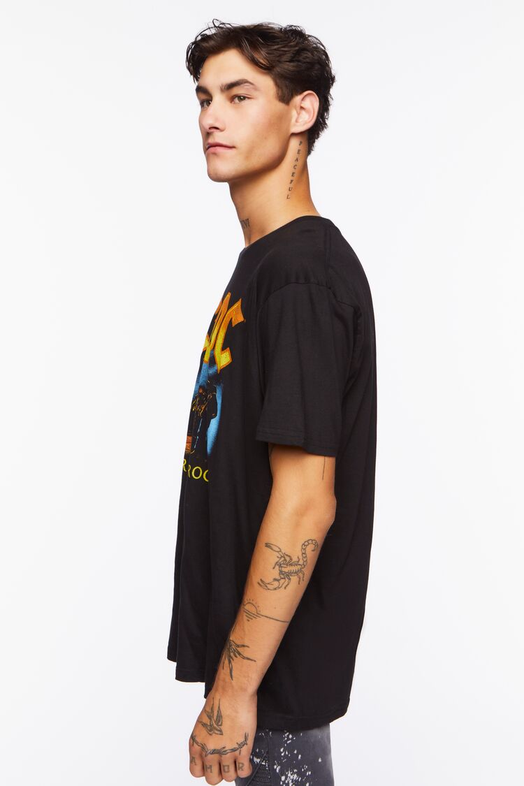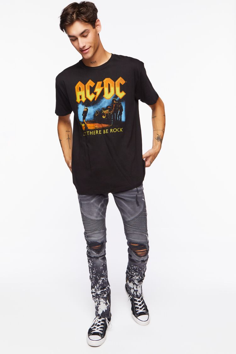 A knit tee featuring front 'ACDC' and 'Let There Be Rock' text with accompanying band member performance graphic. a crew neck. and dropped short sleeves.