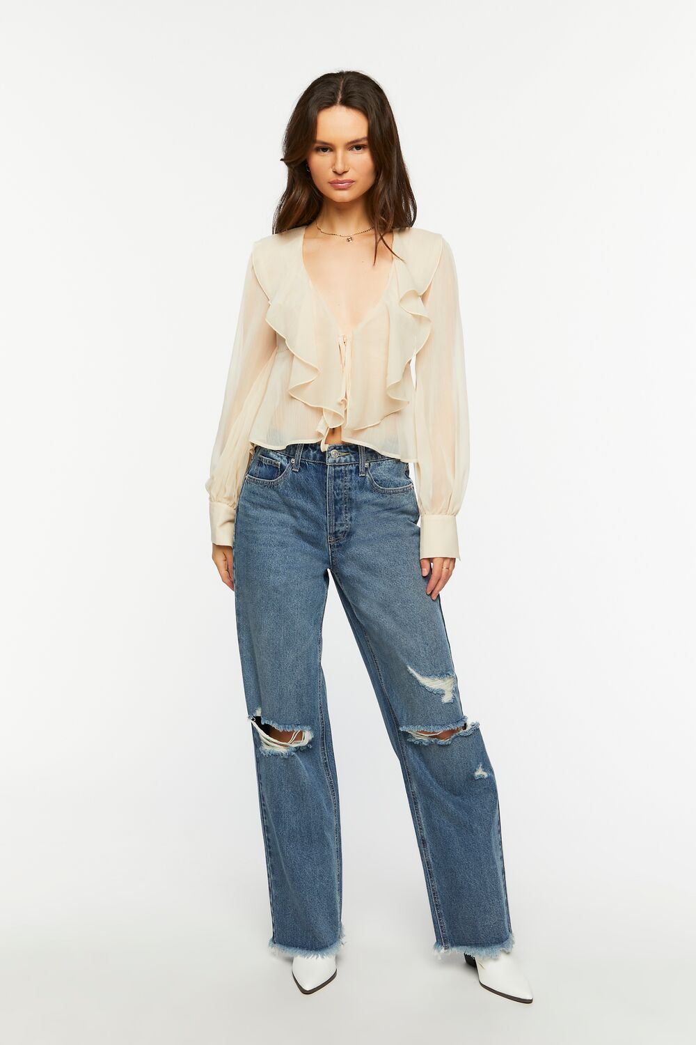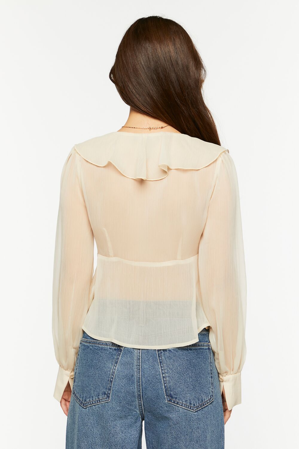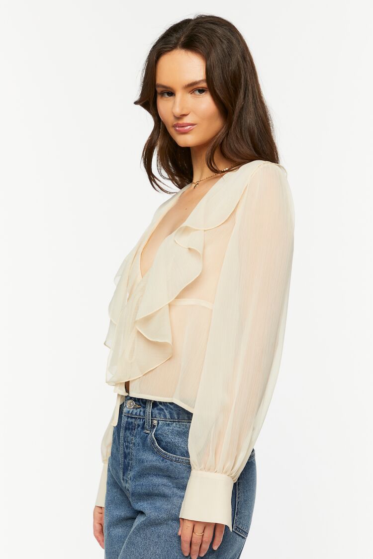 A chiffon top featuring a sheer construction. plunging neckline. split front with self-tie closure. ruffle trim. long sleeves with buttoned cuffs. and flounce hem.