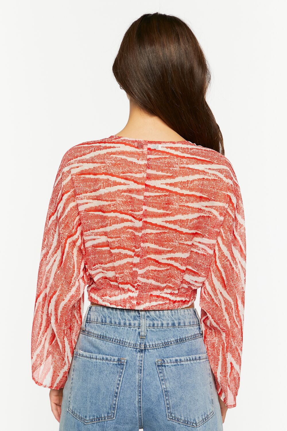 A chiffon crop top featuring an allover abstract pattern. semi-sheer construction. plunging neckline. self-tie front closure. and 3/4 bell sleeves.