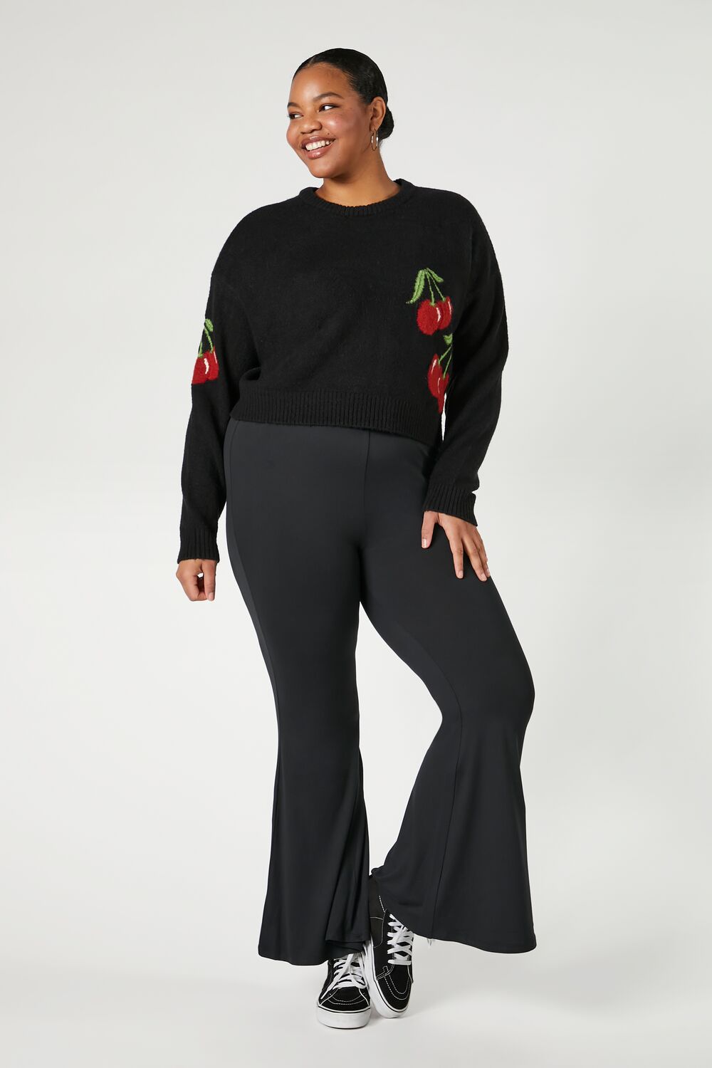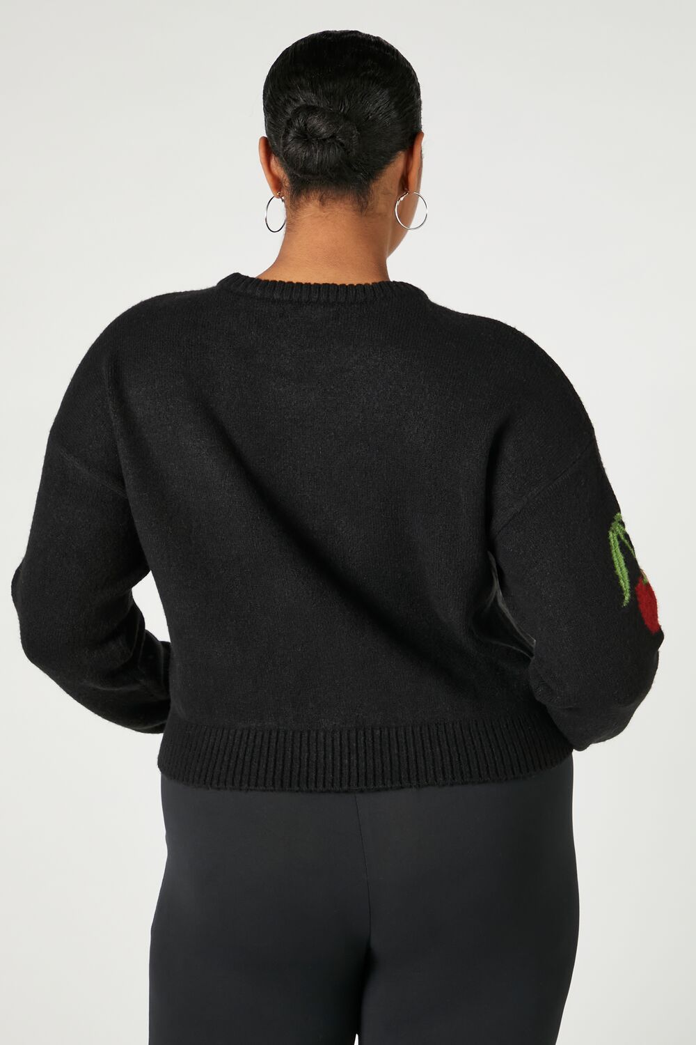 Feelings Star+ - A brushed knit sweater featuring a crew neck. ribbed trim. front and sleeve cherry graphics. dropped long sleeves. and semi-cropped hem.