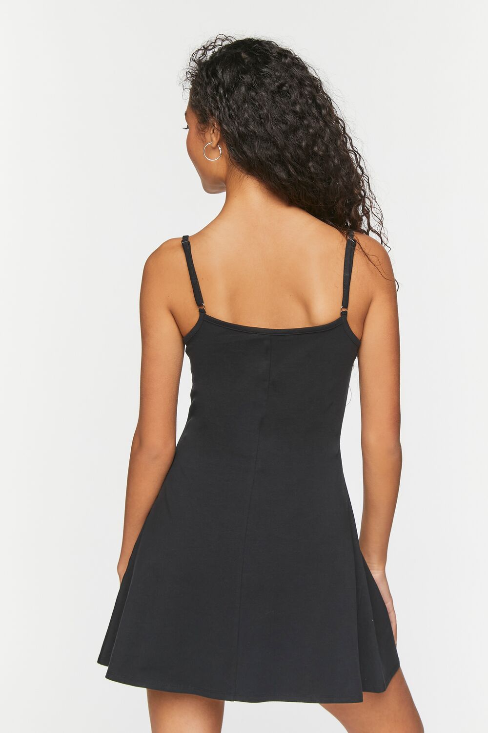 A jersey knit mini dress featuring a scoop neckline. straight-cut back. adjustable cami straps. and A-line silhouette.