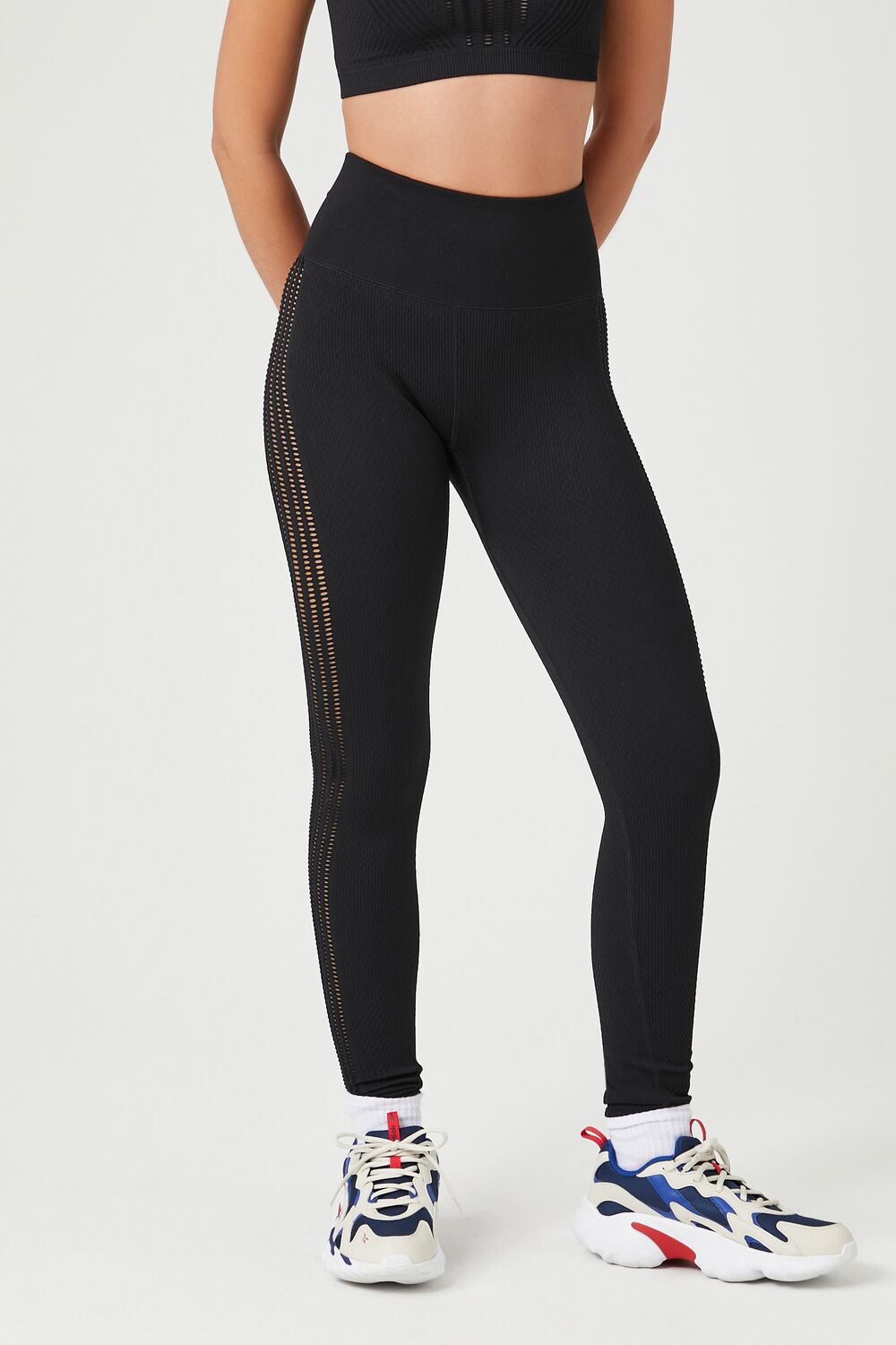 A seamless pair of athletic leggings featuring a high-rise. side cutouts. allover textured construction. cutouts along the leg. a fit that sculpts. lifts. and smooths. and seamless construction with seams that lay flat for ultimate comfort.