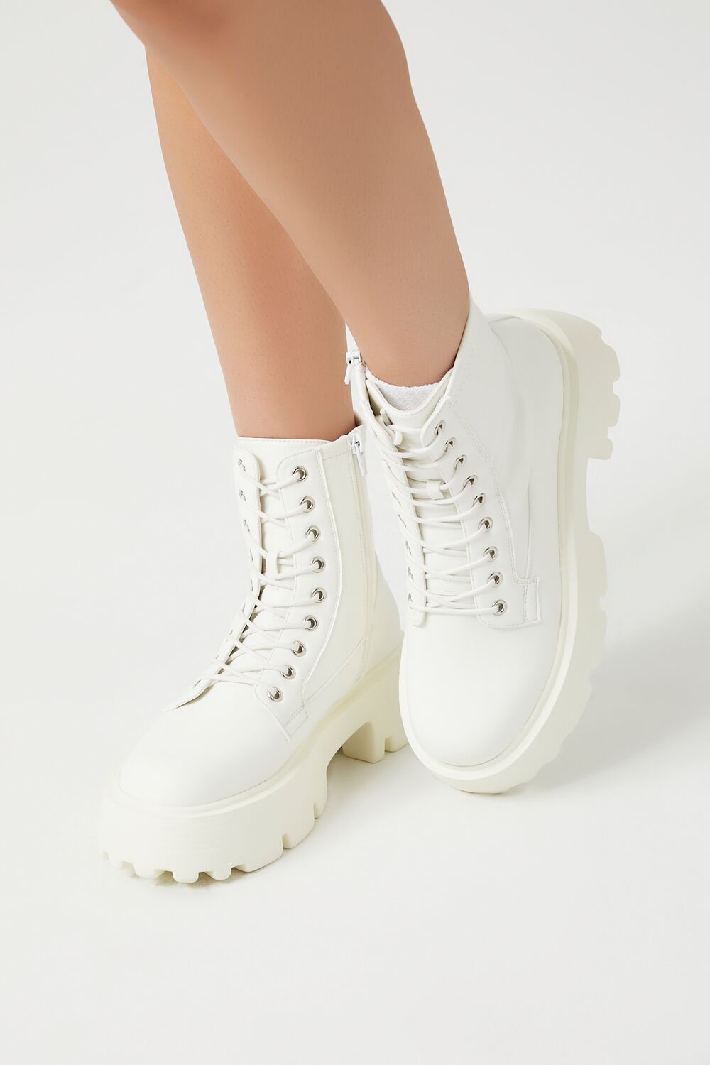 A pair of faux leather ankle booties featuring an almond toe. lace-up closure. side zipper. and a chunky lug sole.
