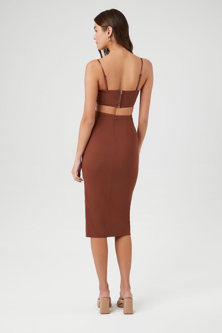 A woven midi dress featuring cutout side details. straight neckline and back. adjustable and removeable straps. and a front side slit.