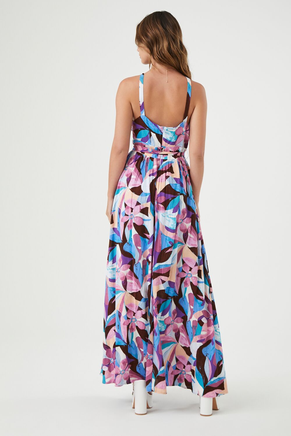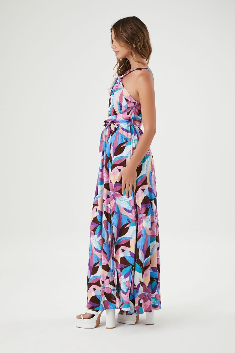 A woven maxi dress featuring an allover abstract print. V-strap neckline. shoulder straps. a self-tie waist. leg slit. and a square-cut back.