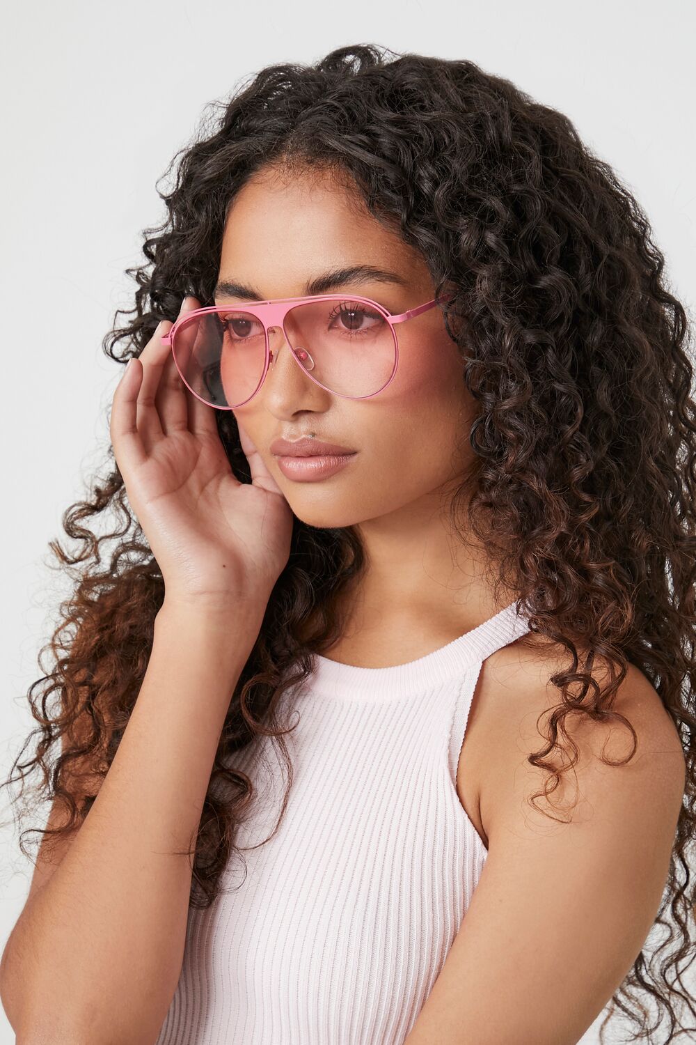 A pair of high-polish aviator sunglasses featuring clear nose pads.