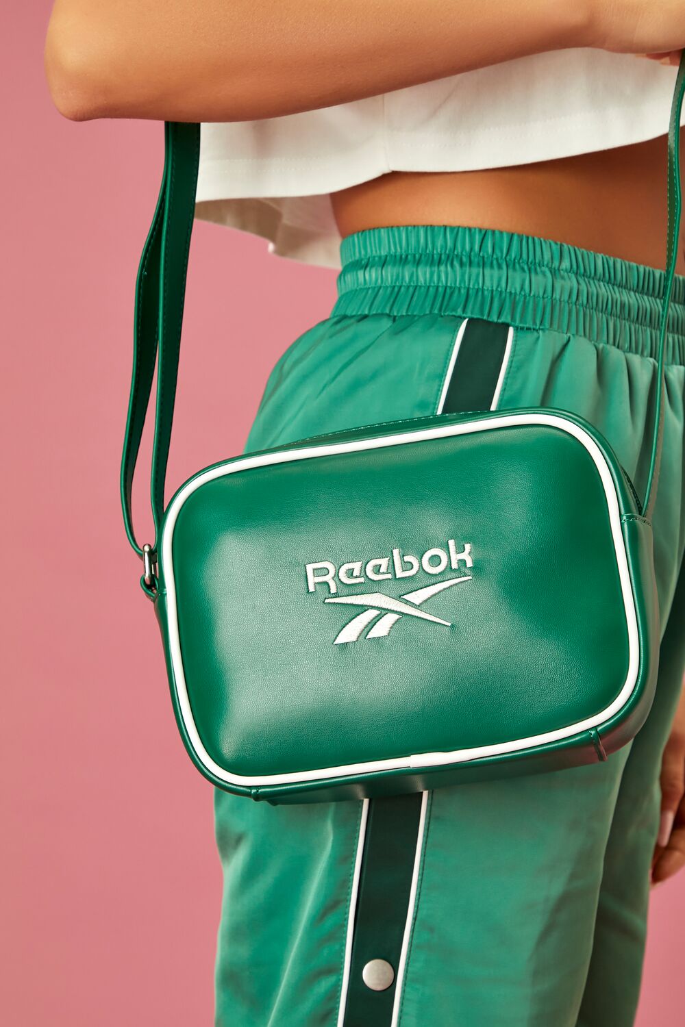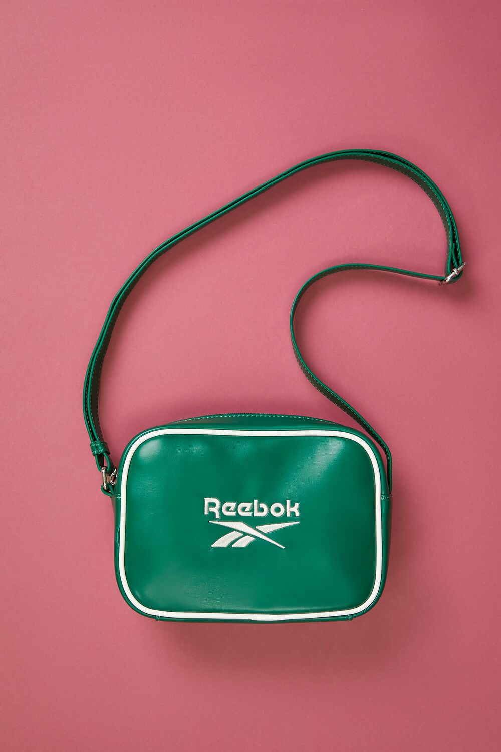 From our Feelings Star x Reebok collection. this faux leather crossbody bag features 'Reebok' text and logo graphics. an adjustable shoulder strap. zip-top closure. and contrasting piped trim.