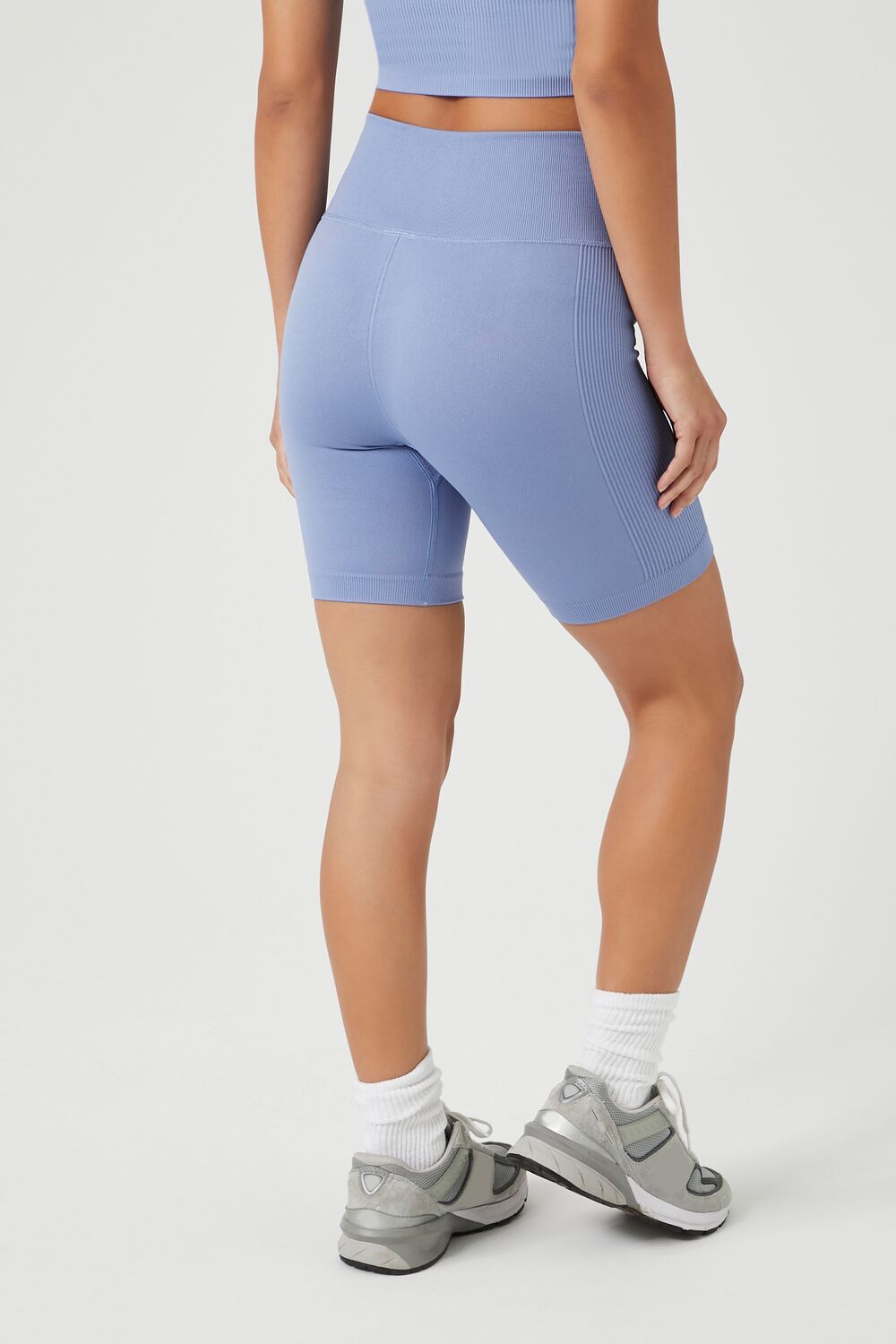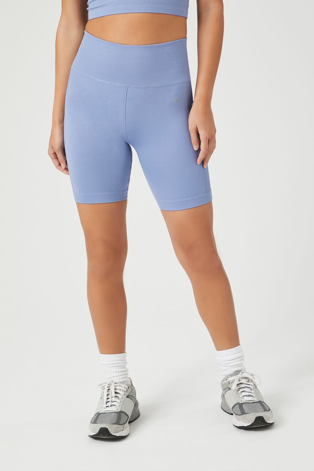 A pair of athletic seamless knit biker shorts featuring a high-rise waist.