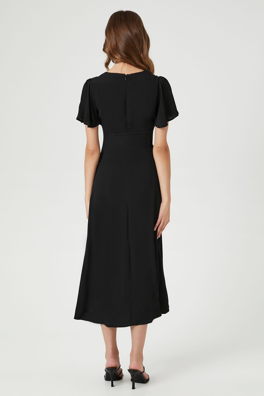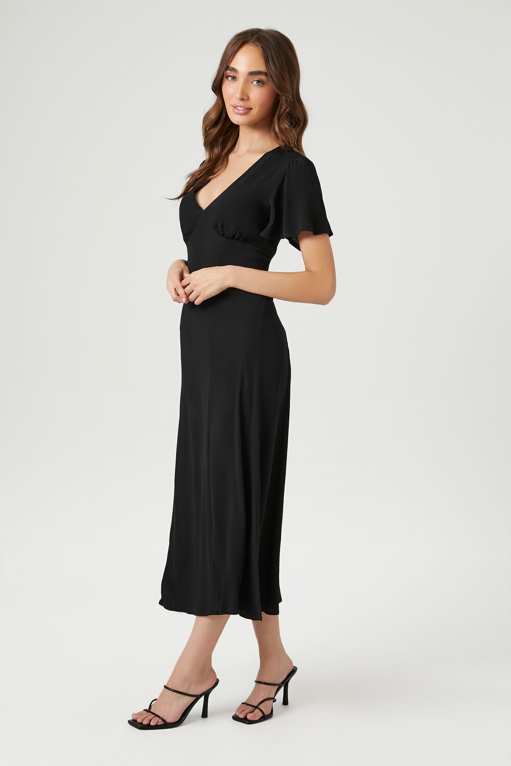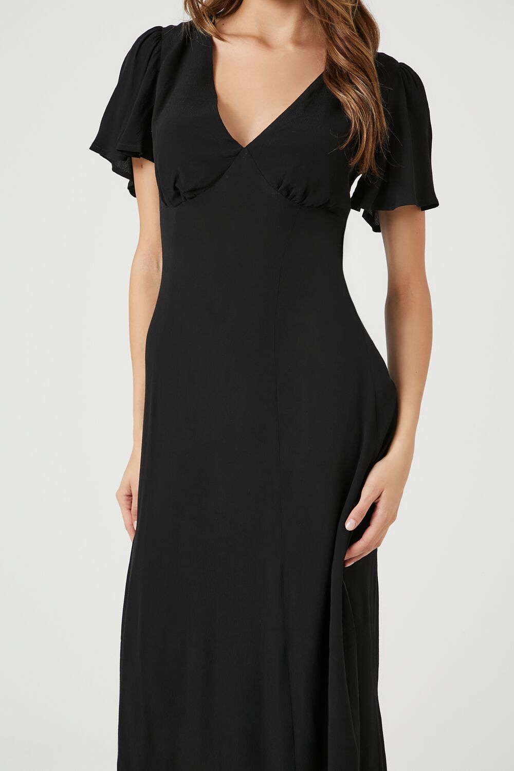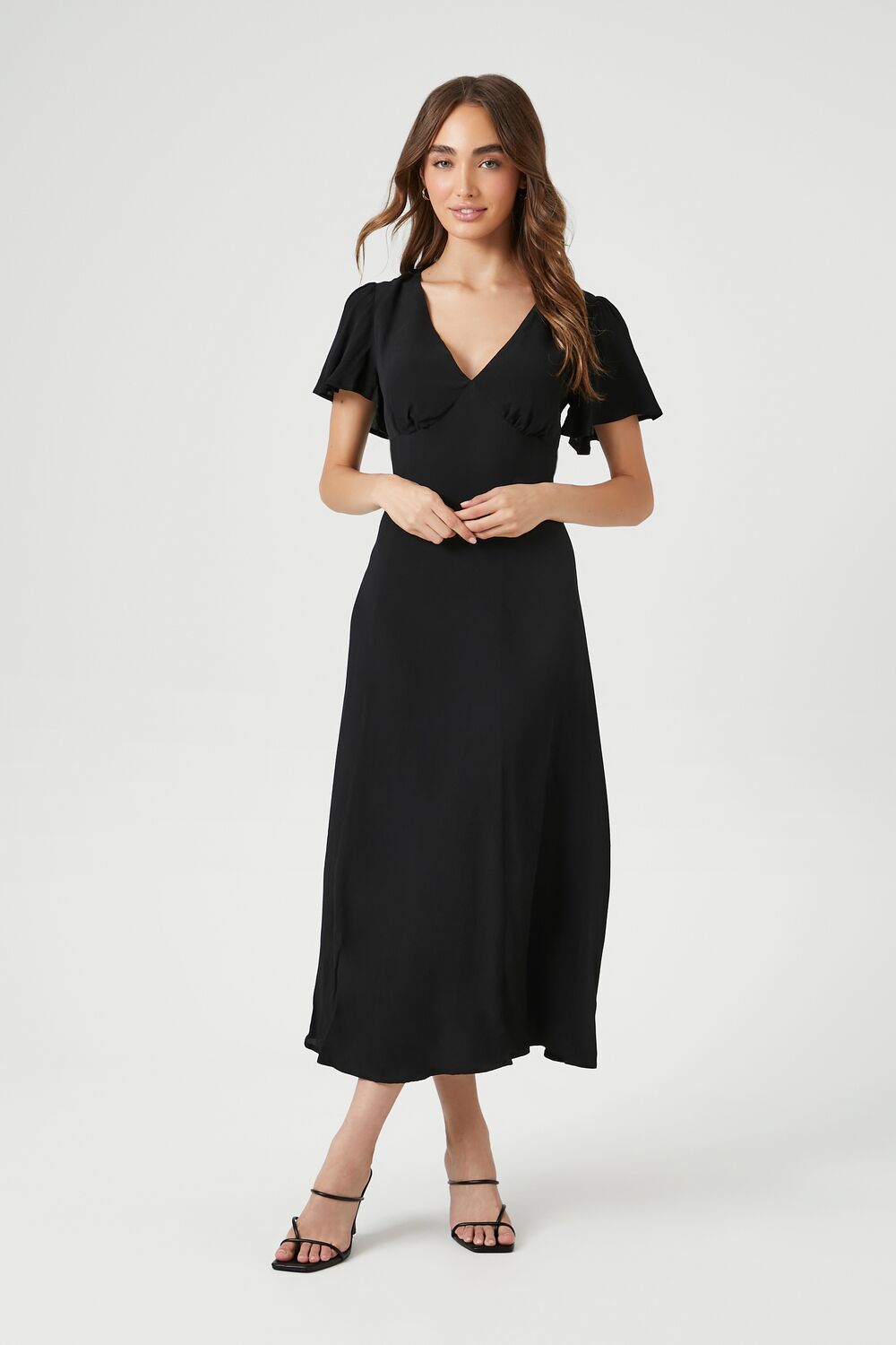A woven midi dress featuring a V-neckline. flounce short sleeves. a shirred bust. concealed back zipper. and a column silhouette.