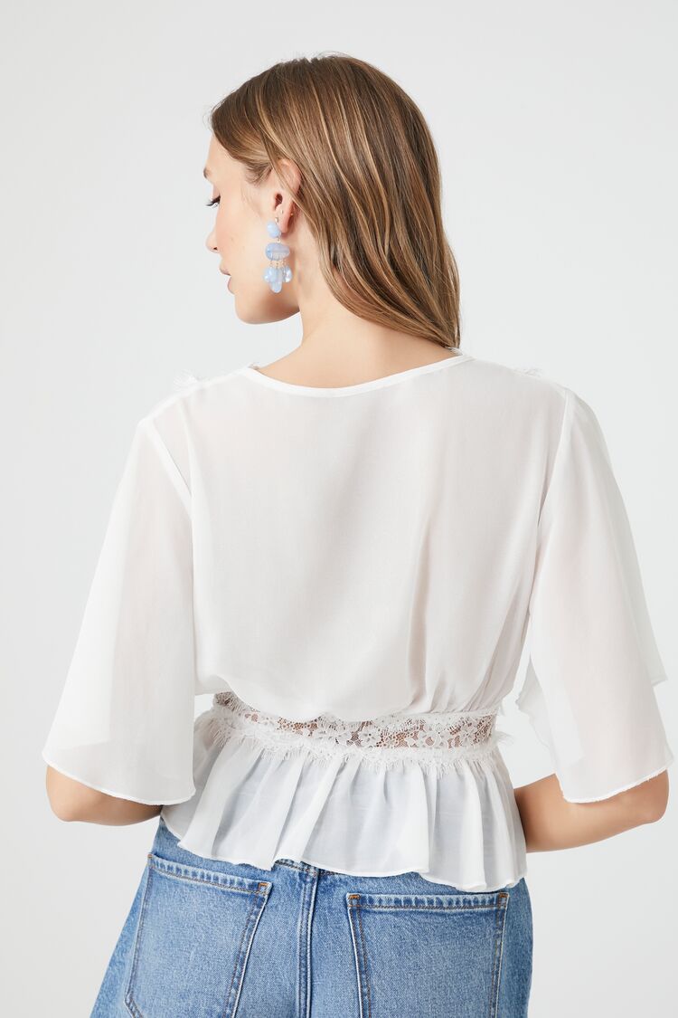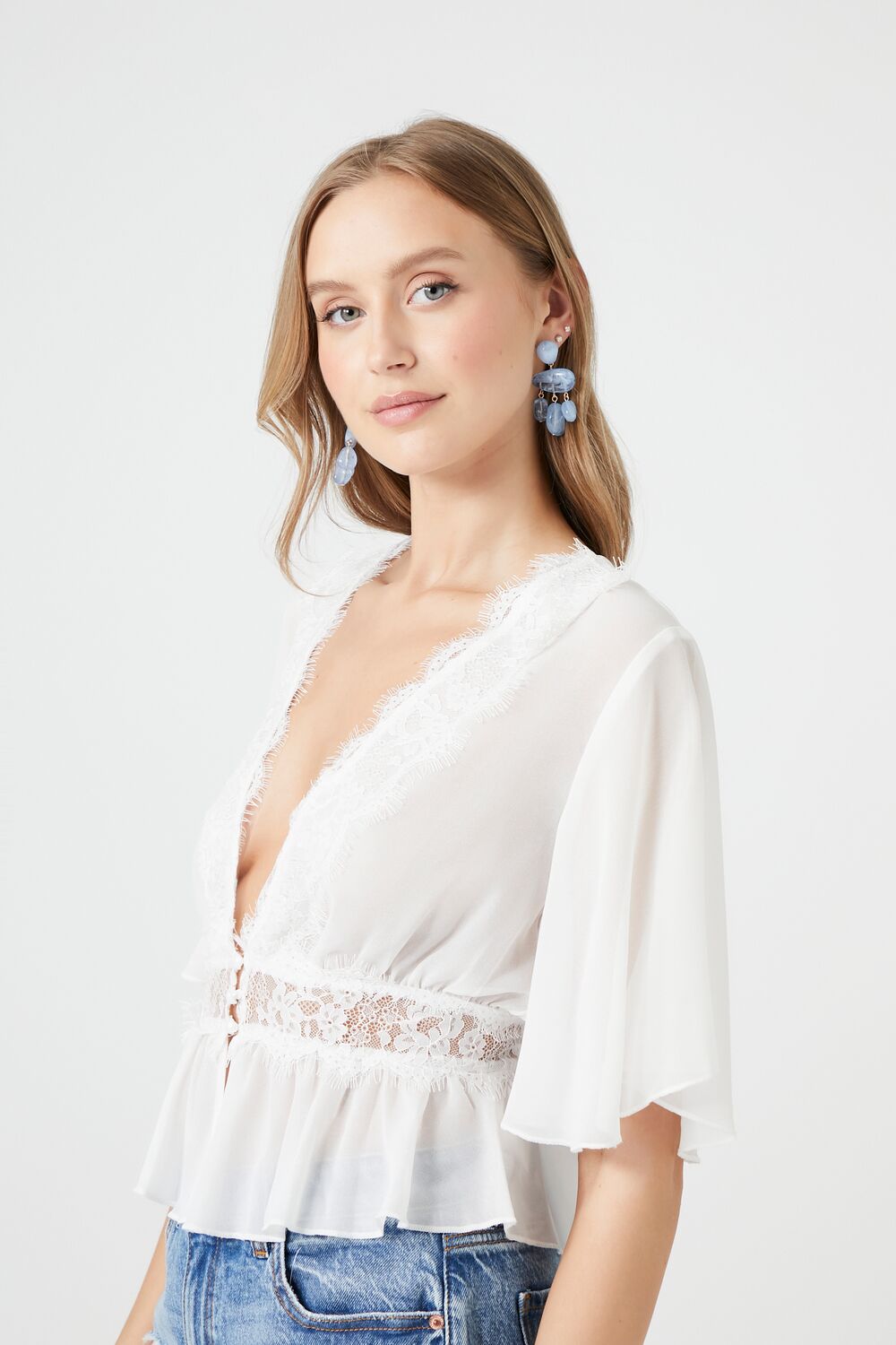 A chiffon top featuring a plunging neckline. eyelash lace trim. 3/4 sleeves. front button-loop closures. and a split flounce hem.
