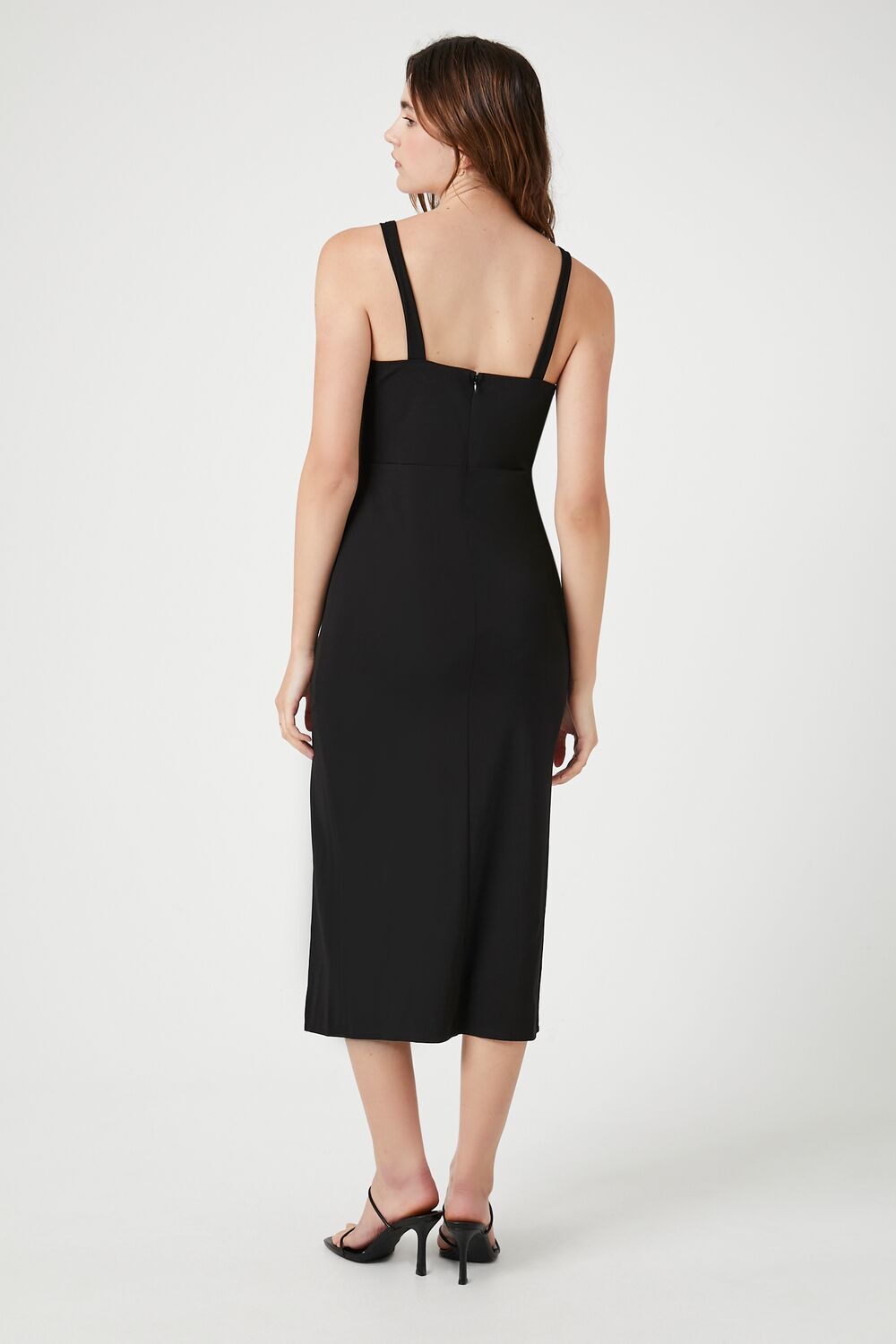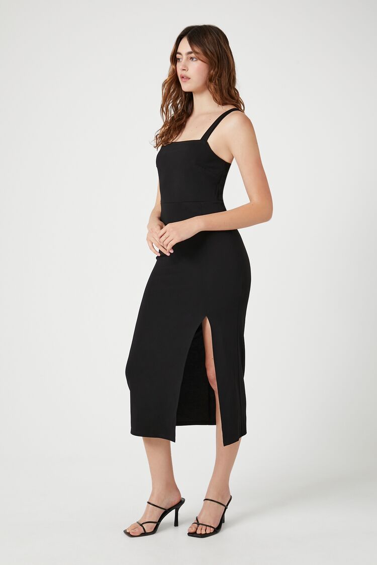 A Ponte knit midi dress featuring a square-cut neckline and back. shoulder straps. concealed back zipper. empire waist. side leg slit. and bodycon silhouette.