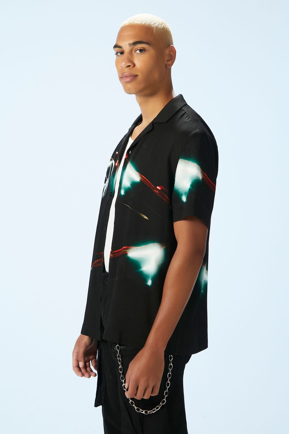A woven shirt featuring an allover abstract car print. short sleeves. a Cuban collar. and button-up front closures.