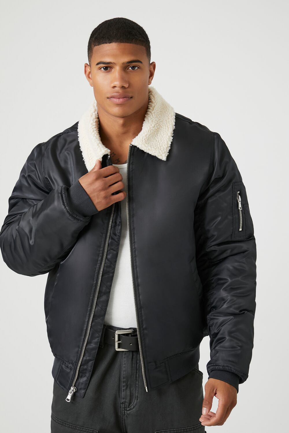 A woven bomber jacket featuring faux shearling trim. a basic collar. zip-up front closure. slanted front pockets. dropped long sleeves. zippered sleeve utility pocket. and ribbed trim.