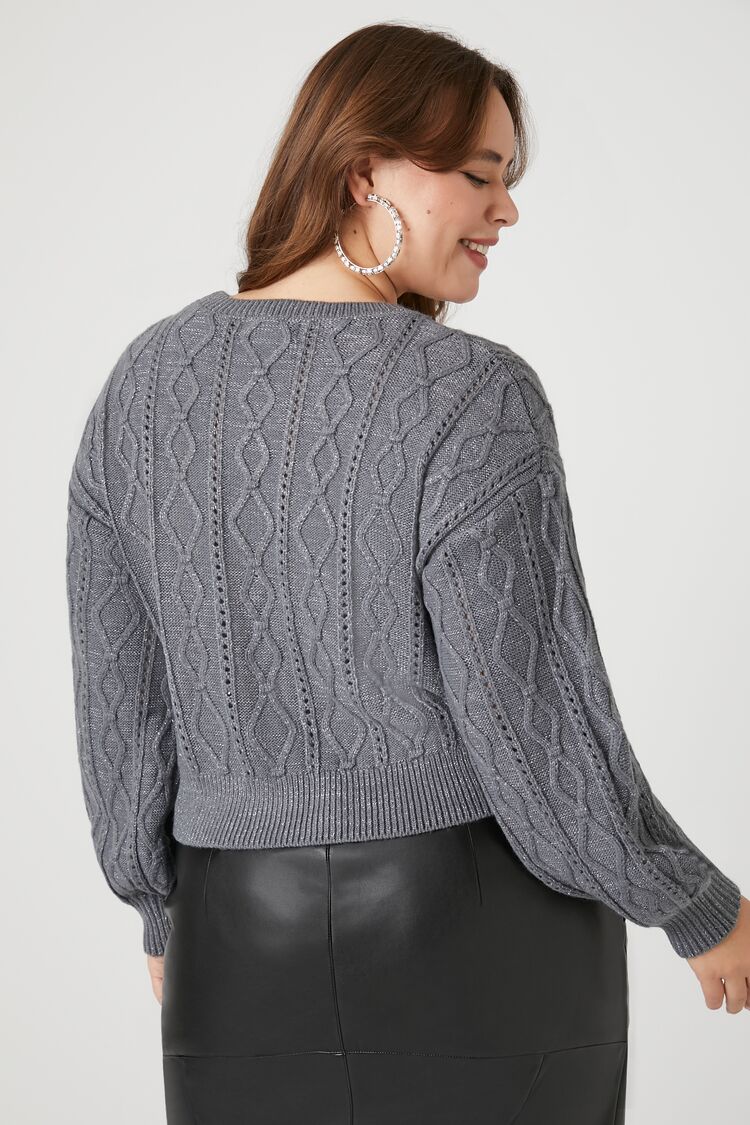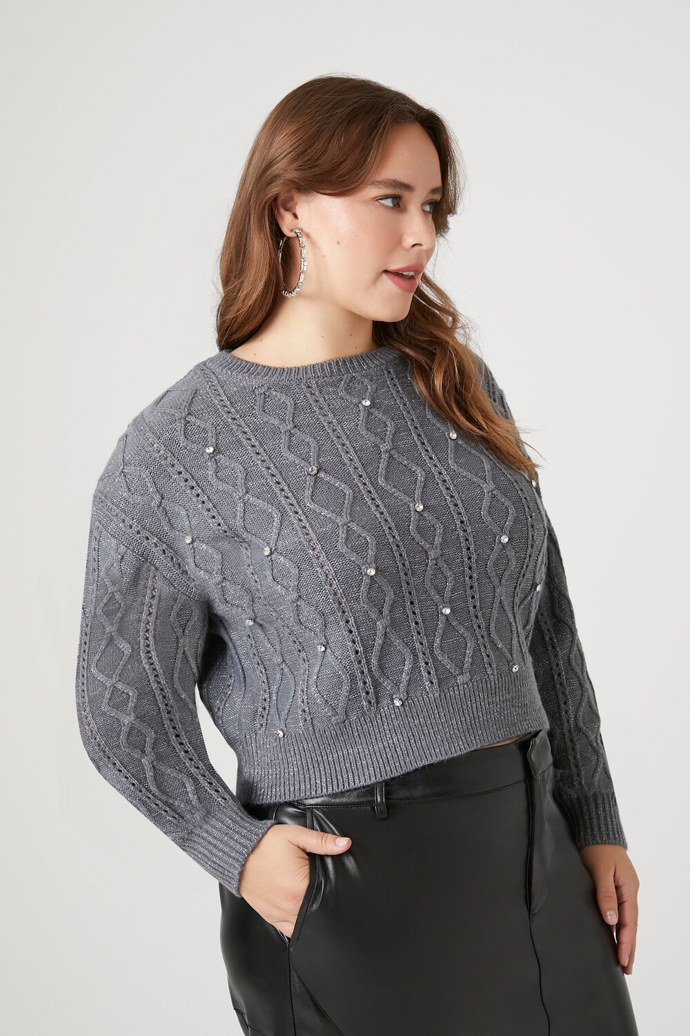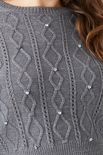 Feelings Star+ - A cable knit sweater featuring dropped long sleeves. front rhinestone embellishments. ribbed trim. and a crew neck.