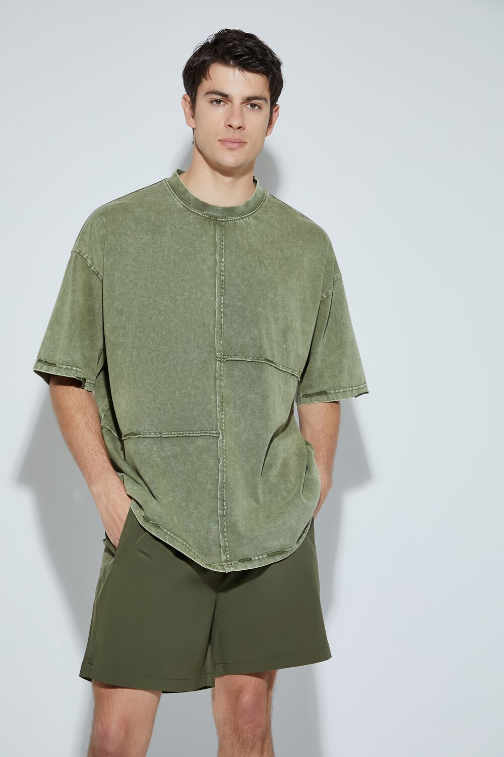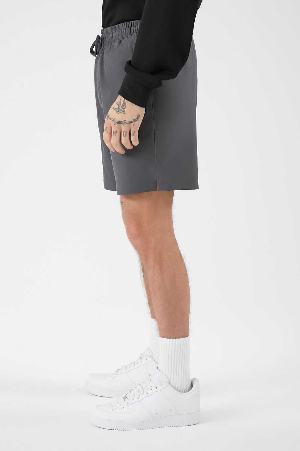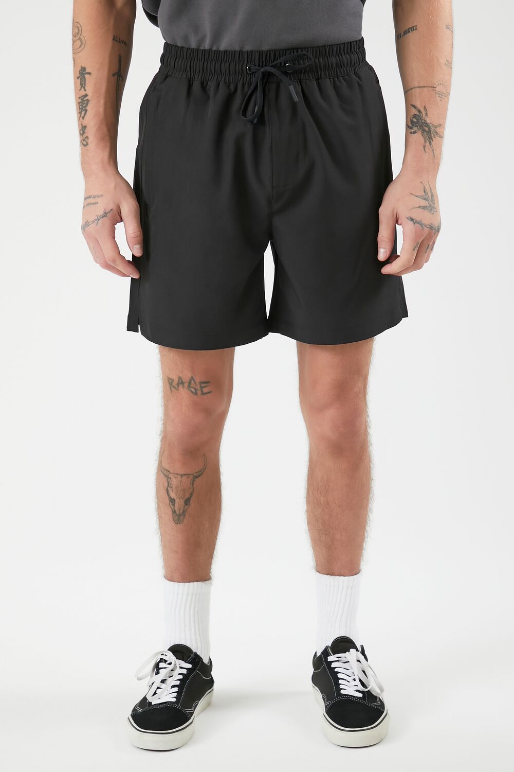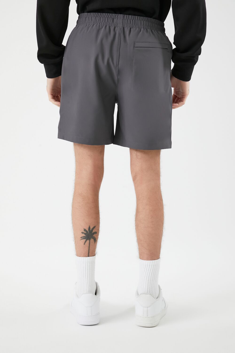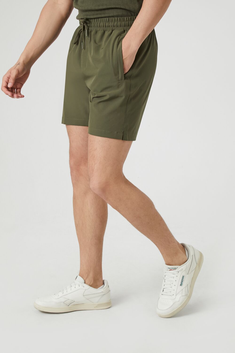 A pair of woven shorts featuring four-way stretch. UV protection. a drawstring waist. mock zip fly. slanted front and back jetted pockets. and vented hem.
